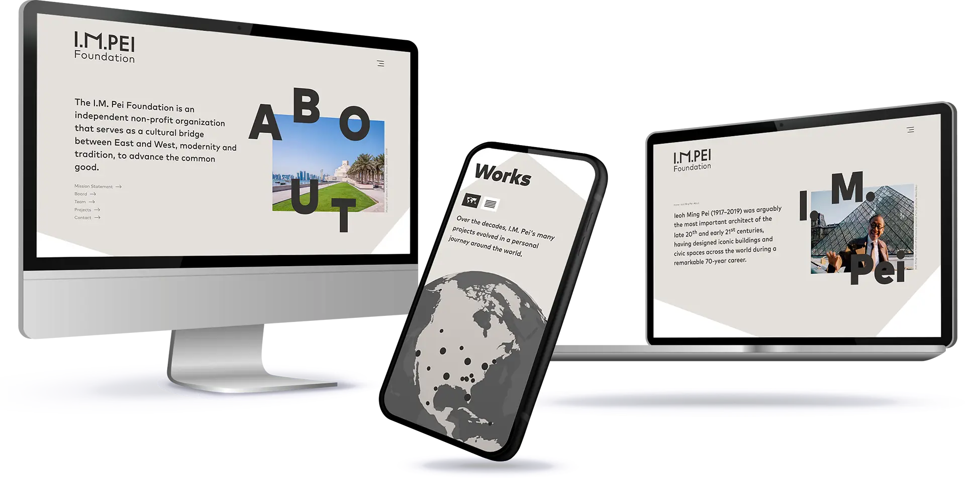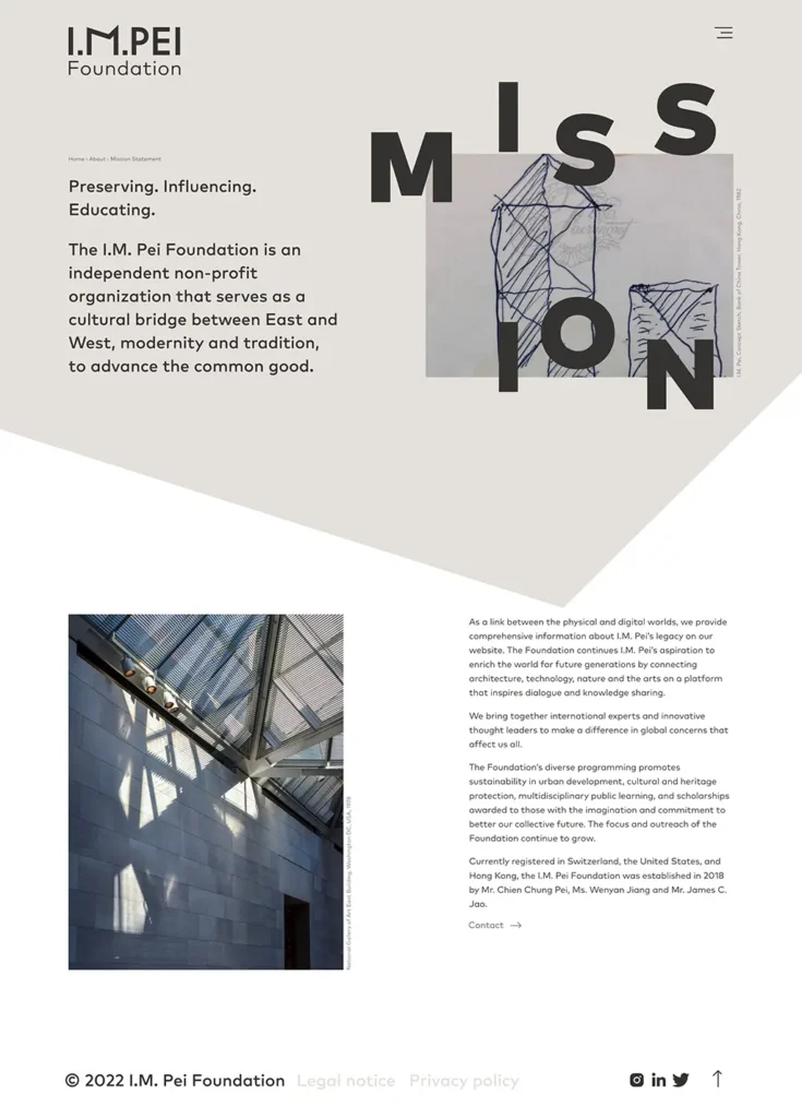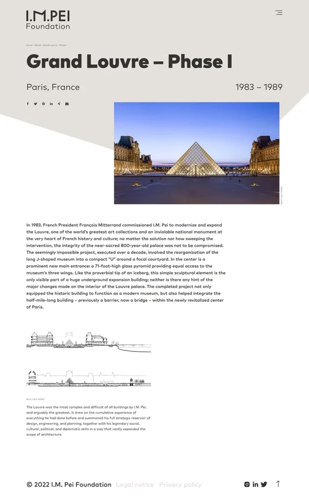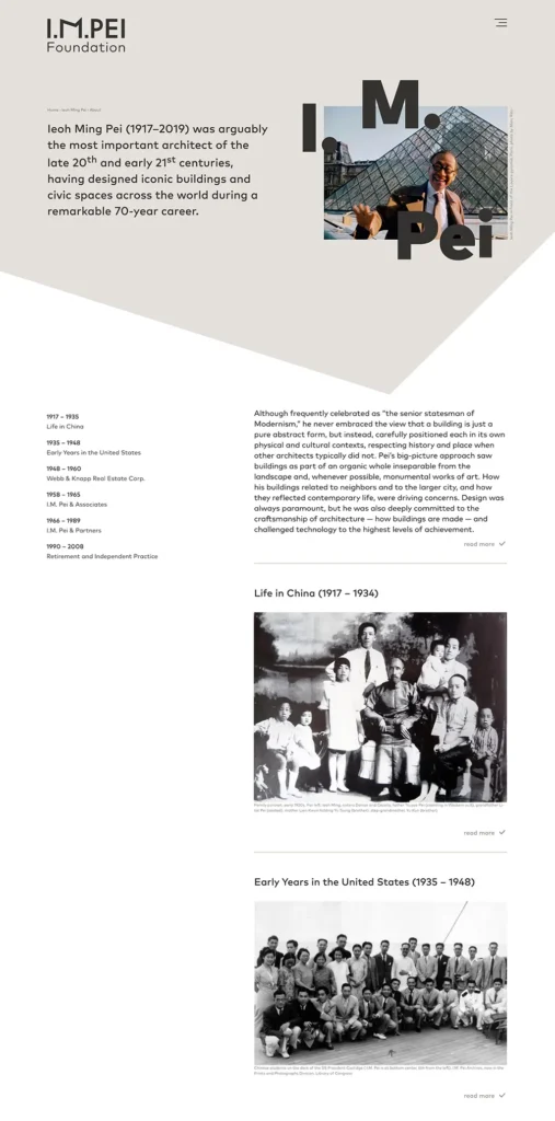 Die Website widmet sich dem Leben und Werken des Architekten Ieoh Ming Pei sowie Projekten der Stiftung.